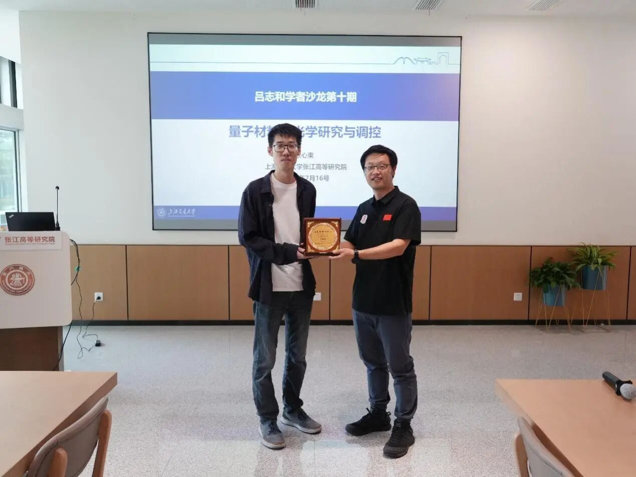 报告结束后,赵德刚为张心束颁发纪念奖牌,以表彰其在园区学术分享与跨学科交流中的贡献。现场随即进入热烈的互动讨论环节,来自人工智能、未来材料、合成科学等多个中心的师生围绕 “超快激光调控的精度极限”“量子材料在能源领域的应用潜力”等问题展开深入探讨。张心束结合自身研究经验,梳理了多学科交叉中的关键科学问题与技术瓶颈,并对该领域未来发展方向提出前瞻性见解,为在场师生带来跨领域启发。
