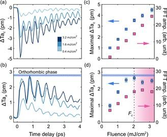 图2:Ta2NiSe5光激发后的原子位移随时间和激发光能量密度的演化