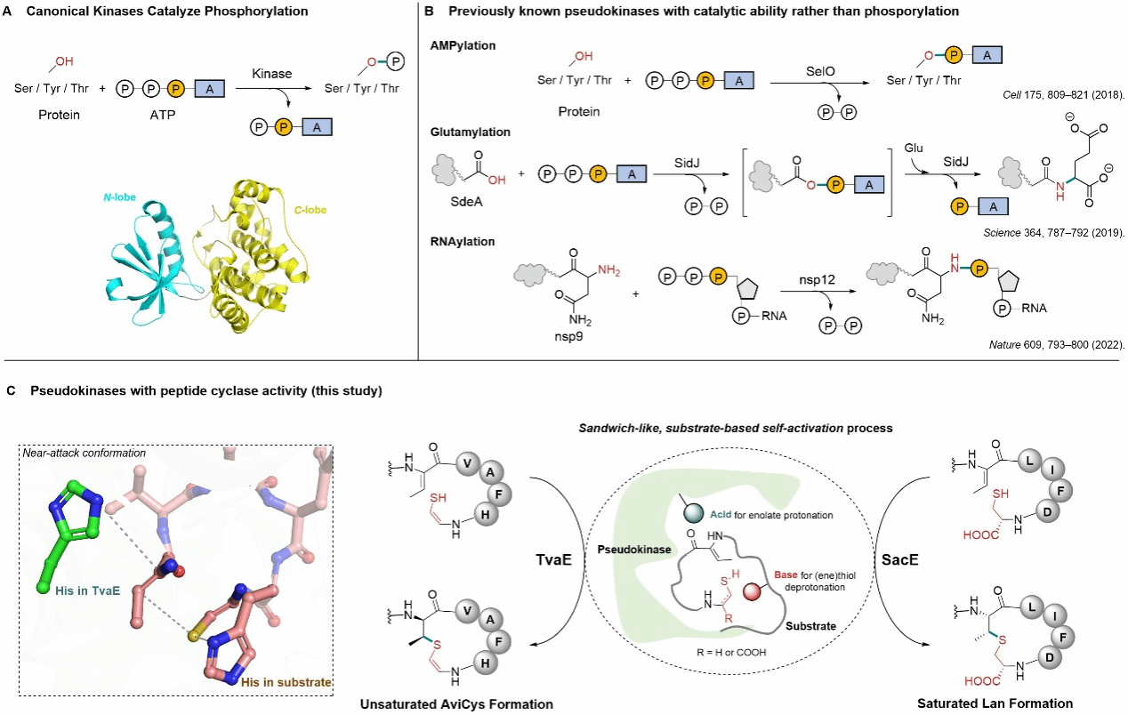 近日,刘文等科研团队在Nature Chemistry杂志上报道的最新合作研究,阐明了硫酰胺类化合物(thioamitides)和羊毛硫肽(lanthipeptides)这两类重要天然产物中关键的分子内环化过程是如何形成的这一关键科学问题。本研究开拓性地发现了假激酶的全新催化机制——"三明治样底物辅助"的迈克尔加成反应。这完全不同于已知的假激酶功能模式。研究揭示了TvaE和SacE这两个假激酶的独特工作机制。以TvaE为例,它与前导肽序列结合形成完整的蛋白激酶折叠结构,这种结构互补是TvaE发挥催化活性的关键。此外,底物肽段中的组氨酸残基(H86)直接参与催化反应,充当碱催化剂激活烯硫醇基团。这种底物辅助催化机制在激酶超家族中极为罕见。这一发现打破了长期以来对假激酶“无催化功能”的传统认识,揭示了蛋白激酶样家族在进化中的“再利用”潜力,也为环状肽类天然产物的生物合成和工程化提供了新思路。