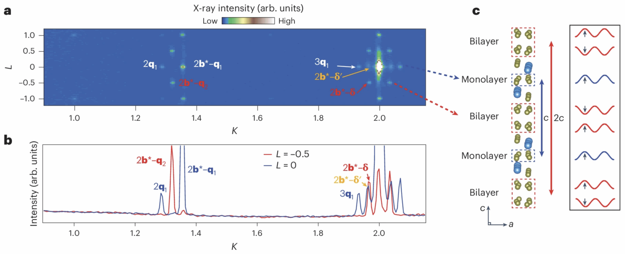 EuTe4因其独特性质日益受到关注,包括巨大热回滞效应,以及对温度不敏感的非公度面内电荷密度波波矢。这些特征表明,堆叠在一起的非公度单层与双层电荷密度波之间存在着复杂的相互作用。然而,堆叠无序等晶体缺陷阻碍了体材料直接实验证据的获得。研究团队通过对机械剥离的超薄EuTe4薄片进行高通量、高分辨率的X射线衍射测量,成功区分出沿面外方向的晶格调制,并首次为具有不同调制矢量的单层与双层电荷密度波的共存提供了直接实验证据(图二):单层的调制矢量q1 = 0.644(5)b*,双层的调制矢量q2 = 0.678(5)b* + 0.5c*,其中b*和c*是倒格子基矢。