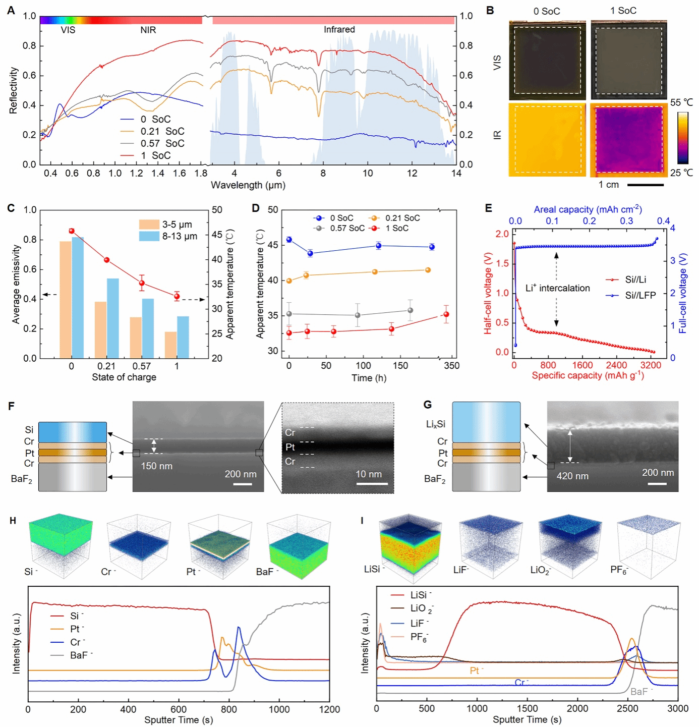 Figure 3: Performance characteristics and structural deformation visualization of SEP devices before and after lithiation. (a) Reflectance test results of SEP devices under different states of charge (SoC) across visible, near-infrared, and infrared bands, showing an overall trend of increasing reflectance with rising SoC. The SEP device used in this experiment measures 2.5 cm × 2.5 cm. (b) Visible light (VIS) and long-wave infrared (LWIR) images of the same SEP device at different SoCs, with the white dashed box indicating the device's active area. (c) Relationship between the average infrared emissivity and apparent temperature of the SEP device in the LWIR band versus SoC. (d) Non-volatile test results of the SEP device under different lithiation states (SoC). (e) Typical voltage-capacity curves of the SEP device (Si//LFP full cell) and a half-cell based on SEP material (Si//Li), demonstrating the Li⁺ insertion process. (f) Schematic cross-sectional structure (left), scanning electron microscopy (SEM) image (middle), and transmission electron microscopy (TEM) image (right) of the SEP material device in the discharged state (Si/Cr/Pt/Cr/BaF₂). (g) Cross-sectional SEM image of SEP material in the charged state (LixSi/Cr/Pt/Cr/BaF₂). (h, i) Time-of-flight secondary ion mass spectrometry (TOF-SIMS) depth profiling of SEP material during discharge (h) and charging (i), showing the distribution of multiple characteristic ion fragments. Above: Three-dimensional spatial reconstruction images of representative ions. Li₂O and LiF generate LiO₂⁻ and LiF₂⁻ ion signals, respectively, while LixPFy and residual lithium salts produce PF₆⁻ ion signals.