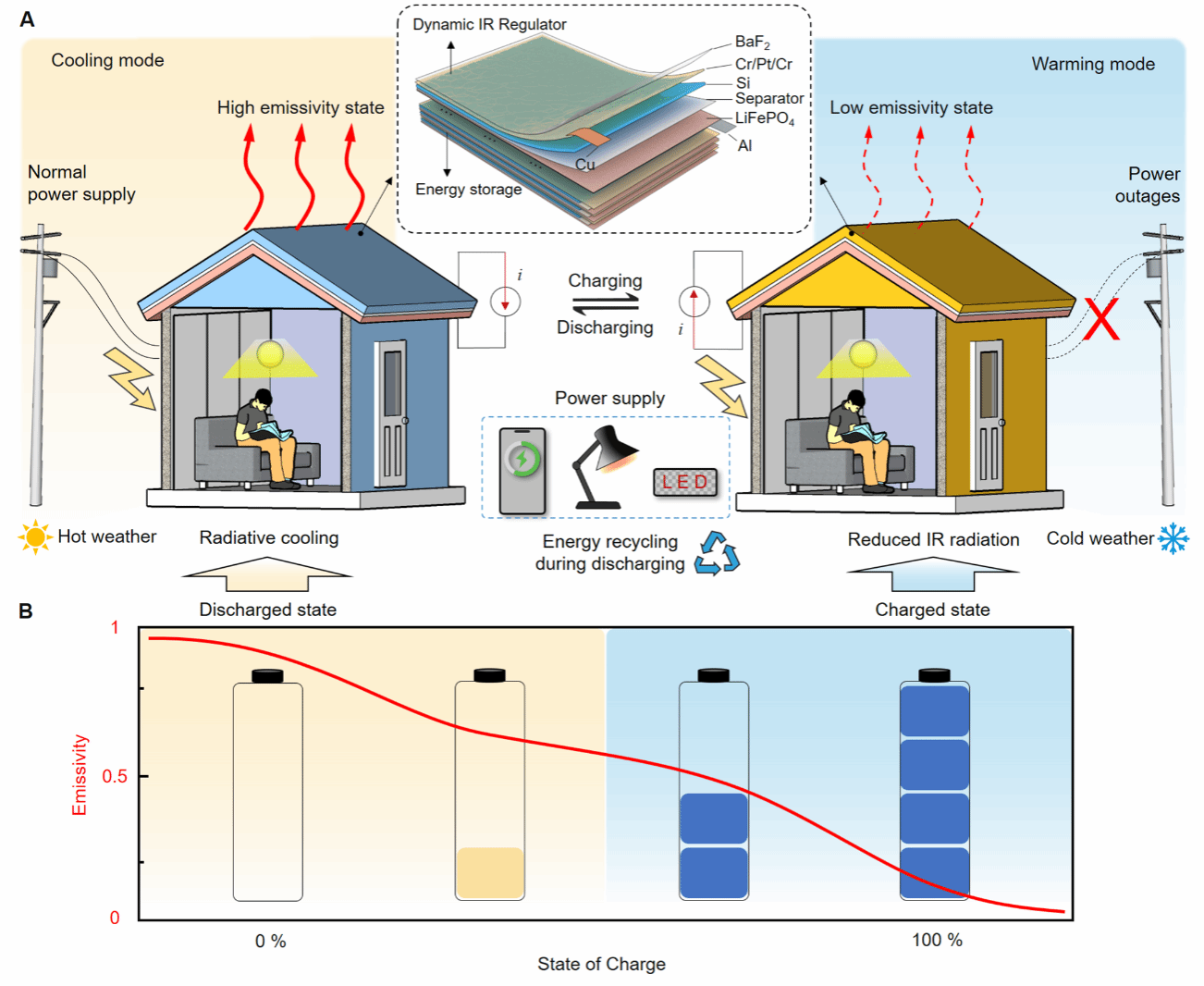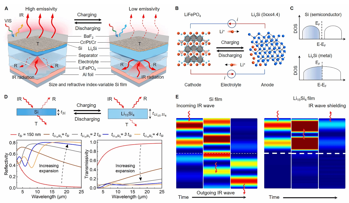 Addressing the limitations of existing thermal management materials—which offer single-functionality and cannot simultaneously regulate temperature and supply energy—this study draws inspiration from the color-changing properties of cephalopod skin. It proposes a novel photonic battery (SEP) that integrates dynamic thermal management with energy storage. The design principle and fabrication process are illustrated in Figure 1. The device achieves reversible lithium-ion insertion/extraction, inducing phase transitions and dimensional changes in silicon material to modulate its infrared emissivity. This enables radiative cooling in summer and thermal insulation/heating in winter while providing efficient electrical energy storage and power supply capabilities. Its structure and optical regulation properties are illustrated in Figure 2. The lithiumation process in SEP devices significantly enhances silicon layer reflectivity, achieving a controllable reflectance range up to 0.67 in the mid-to-far infrared band (8–13 μm). Thermal management and energy storage performance are illustrated in Figure 3. SEP devices enable controllable infrared emissivity adjustment across different charge/discharge states: exhibiting high emissivity (active cooling) during discharge and low emissivity (thermal insulation/heating) during charging. Concurrently, the device delivers an energy storage capacity of up to 3271 mAh/g, ensuring stable power supply for electronic devices during power outages. Global energy consumption simulations (Figure 4) demonstrate that when applied to building facades, SEP devices achieve an average annual building energy savings of 18.4% across diverse climate zones, reducing CO₂ emissions by 124.1 tons per year. This highlights broad prospects for energy conservation, emissions reduction, and green building applications. Future deployment is anticipated in building energy self-sufficiency, smart energy management, and extreme environment protection.