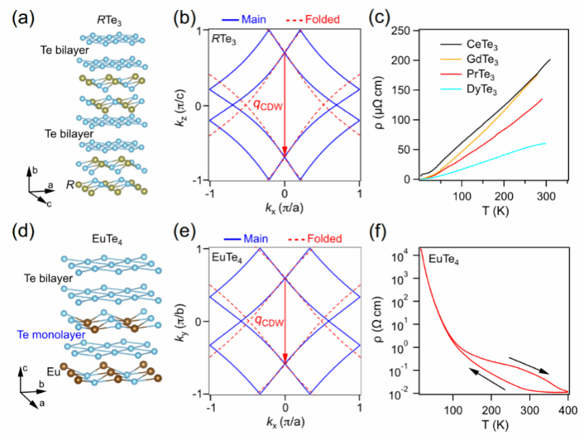 Coexisting orders represent a key feature of strongly correlated materials, giving rise to numerous fascinating phenomena ranging from unconventional superconductivity to topological order. Unraveling the microscopic mechanisms and interactions underlying macroscopic coexistence phenomena remains a major challenge in condensed matter physics. In solid-state materials, ordered states arising from symmetry breaking are often accompanied by the emergence of energy gaps near the Fermi level, with gap widths proportional to the amplitude of the order parameter. A classic example is the charge density wave (CDW). Historically, in one-dimensional chain systems, Fermi surface nesting was considered the primary cause of CDW ordering, leading to a transition from a metallic to a semiconducting state. However, in quasi-two-dimensional materials, the complex Fermi surface structure often makes perfect nesting difficult to achieve, and the CDW gap typically does not open uniformly across the Fermi surface. Consequently, even in the CDW state, the system remains metallic. Recent studies reveal that both the RTe₃ system (where R represents lanthanide elements excluding Pm, Eu, Yb, and Lu) and EuTe₄ are quasi-two-dimensional CDW materials, with the CDW originating from the Te lattice. Surprisingly, despite sharing similar partially nested Fermi surface structures, their electrical transport properties exhibit significant differences. As shown in Figure 1, RTe₃ exhibits metallic behavior, whereas EuTe₄ displays anomalous semiconductor transport properties accompanied by a substantial thermal hysteresis effect [1-2], attracting extensive attention from researchers [3-7].