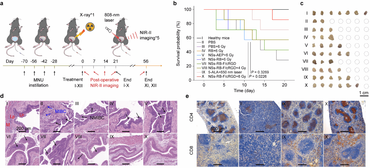 Following the establishment of a spontaneous bladder cancer mouse model, the nanoparticle theranostic probe was instilled into the bladder. After a single 6Gy dose of X-ray irradiation, in vivo NIR-II imaging was performed weekly for five consecutive sessions to monitor disease progression. By monitoring mouse survival rates at 21 and 56 days, combined with H&E staining and immunohistochemical analysis, it was confirmed that a single X-ray treatment could eliminate tumors, improve survival rates, restore immune balance, and suppress tumor recurrence. Furthermore, NIR-II imaging enabled in situ assessment of postoperative tumors (Figure 3).