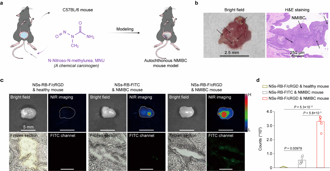 A nanoscintillator-based diagnostic and therapeutic probe was constructed by functionalizing the surface of nanoscintillators with the photosensitizer Rose Bengal (RB) and the targeting peptide cRGD, achieving reactive oxygen species (ROS) generation and enhancing the probe's tumor enrichment efficiency. In this study, a spontaneous bladder cancer mouse model was established using the drug N-nitroso-N-methylurea (MNU). Histopathological analysis of mouse bladder tissue via H&E staining revealed distinct papillary tumor structures within the bladder, confirming successful model establishment (Figure 2). To validate the specific targeting of tumor tissues by cRGD-modified nanodiagnostic probes, these probes were instilled into the bladders of healthy mice and cancer-bearing mice. As a control, non-cRGD-modified probes were instilled into the bladders of cancer-bearing mice. Ex vivo bladder tissue was analyzed via NIR-II imaging and cryosectioning. Results demonstrated that the cRGD-targeted peptide significantly enhanced the enrichment efficiency of the nanodiagnostic probe within tumor tissues.