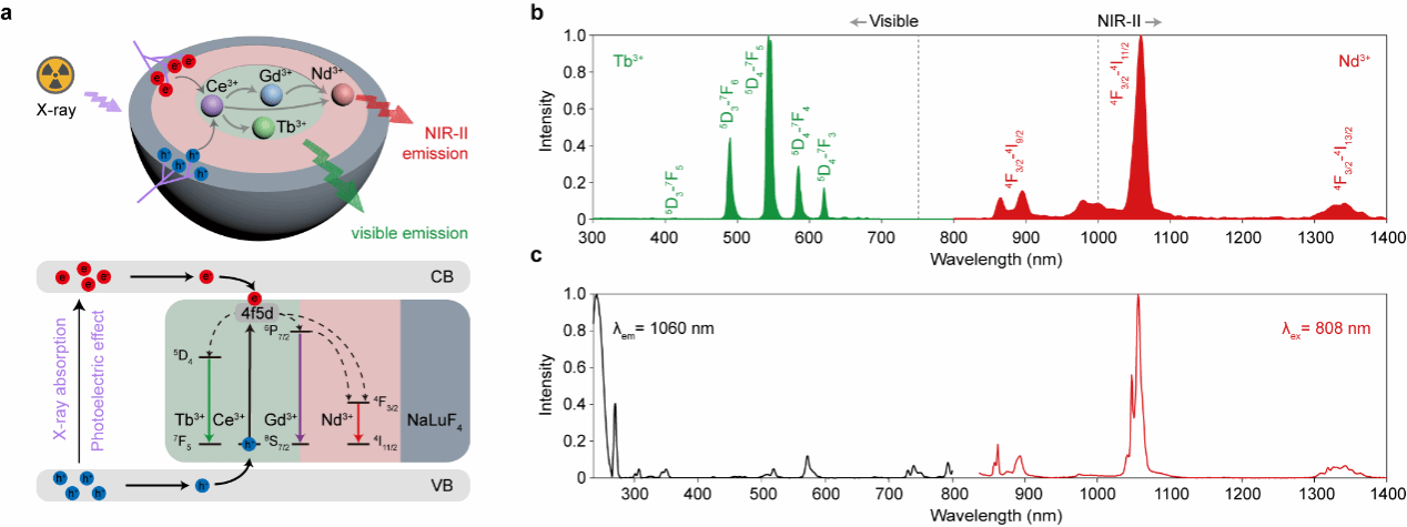 Unlike previously reported single-emission nanoscintillators, this study designed a core-shell-shell nanoscintillator structure to achieve synergistic sensitization through multiple luminescence modes (Figure 1). Low-phonon-energy NaGdF₄ was selected as the scintillator matrix. Ce³⁺ and Tb³⁺ were doped into the core, Nd³⁺ into the first shell layer, and the outermost NaLuF₄ layer served as both an inert layer and a sensitization layer. Thermally injected nanocrystals with a core-shell structure were synthesized, spatially isolating doped ions to eliminate cross-relaxation. Ce³⁺ with f-d transitions synergistically sensitized the dual luminescent centers of Tb³⁺ and Nd³⁺, enabling dual emission in the visible and near-infrared II (NIR-II) regions upon X-ray excitation. Results demonstrated that the introduction of Ce³⁺ enhanced visible and NIR-II luminescence by 2.2-fold and 12-fold, respectively.