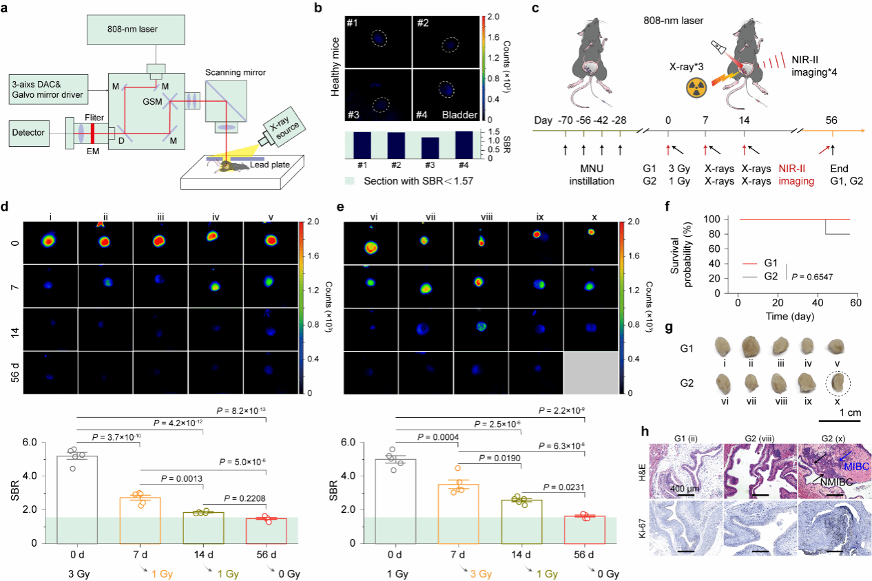 The research team further developed a rapid near-infrared photon-counting system capable of multi-source excitation, enabling rapid quantitative analysis of the signal-to-background ratio in imaging. This allows for real-time adjustment of radiation doses (Figure 4). Two distinct radiation experimental groups (G1 and G2) were established. Groups G1 and G2 initially received doses of 3 Gy and 1 Gy, respectively, followed by additional radiation doses based on the signal-to-background ratio from imaging. Group G1 achieved a 56-day survival rate of 100%, while Group G2 reached 80%, indicating the differential impact of varying radiation regimens on tumor treatment and survival rates in mice. Combined with H&E staining and immunohistochemical results from mouse bladder and spleen tissues, this study confirms that NIR-II imaging-guided fractionated photodynamic therapy enables comprehensive preoperative, intraoperative, and postoperative monitoring and decision-making for bladder cancer.